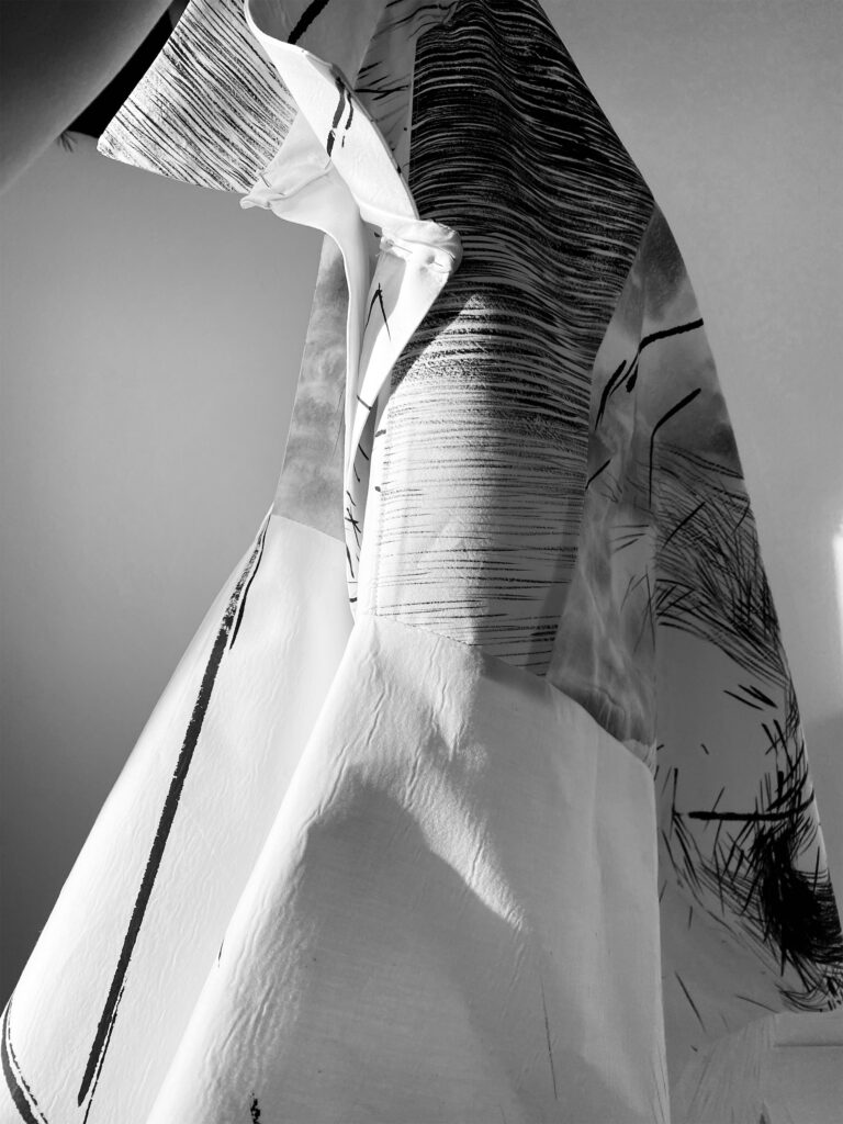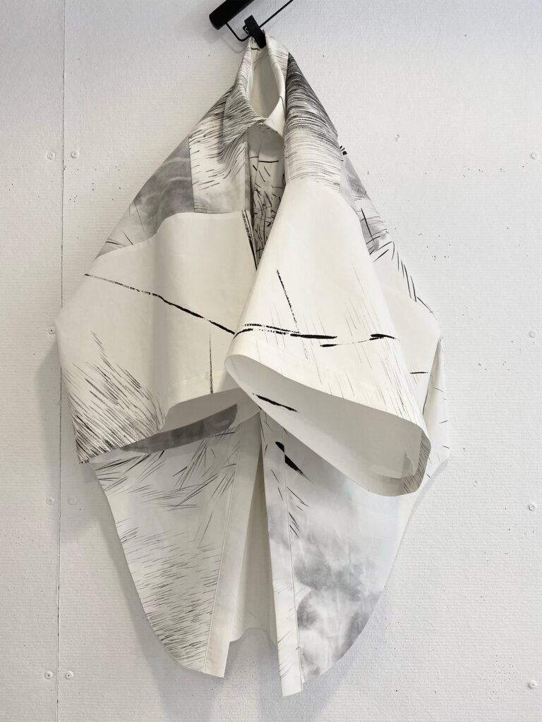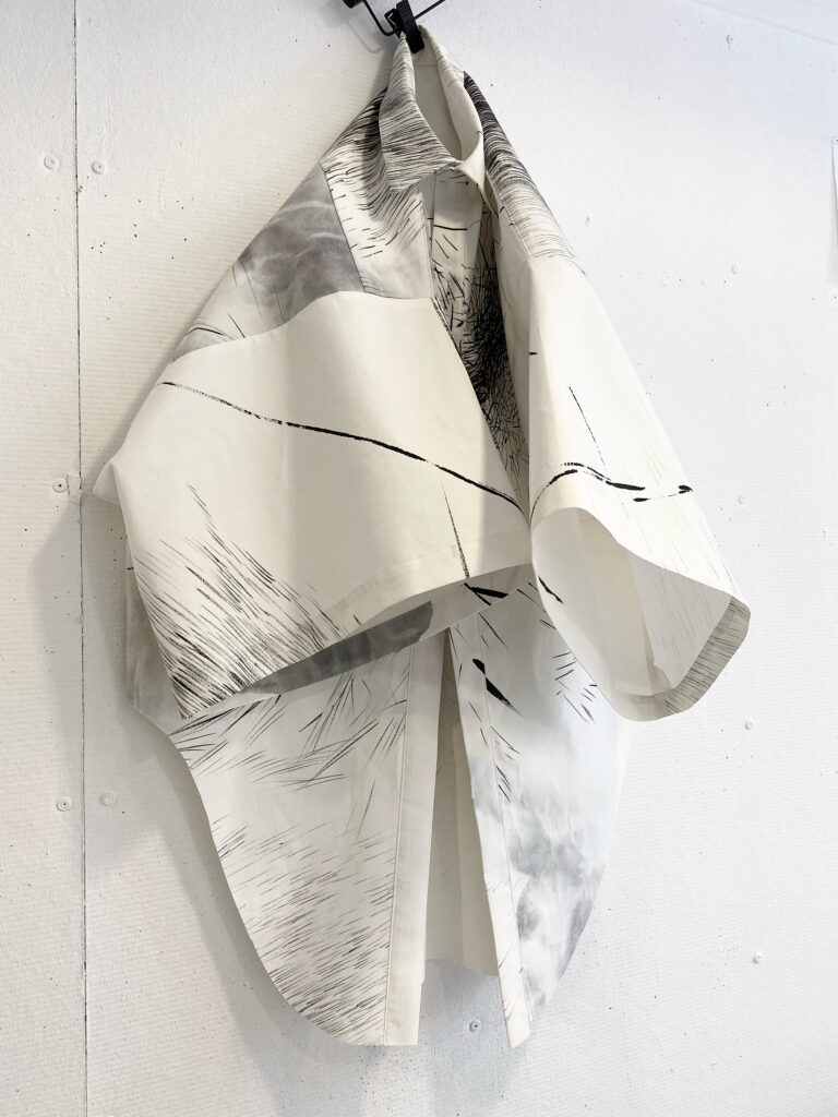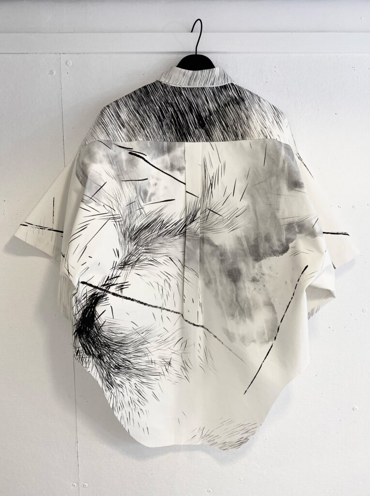 Wearable art piece, hand-painted in sumi ink on bonded, paper-like cotton, one-off KIMO shirt