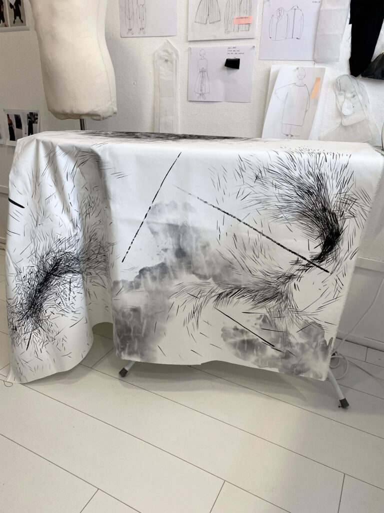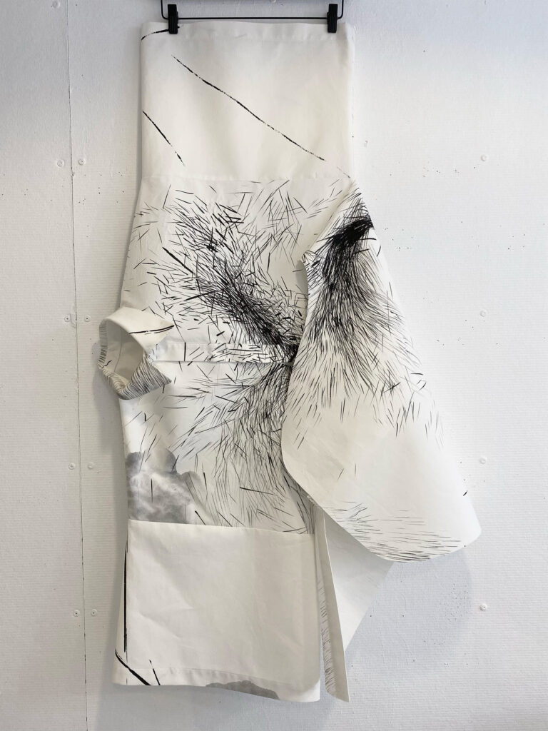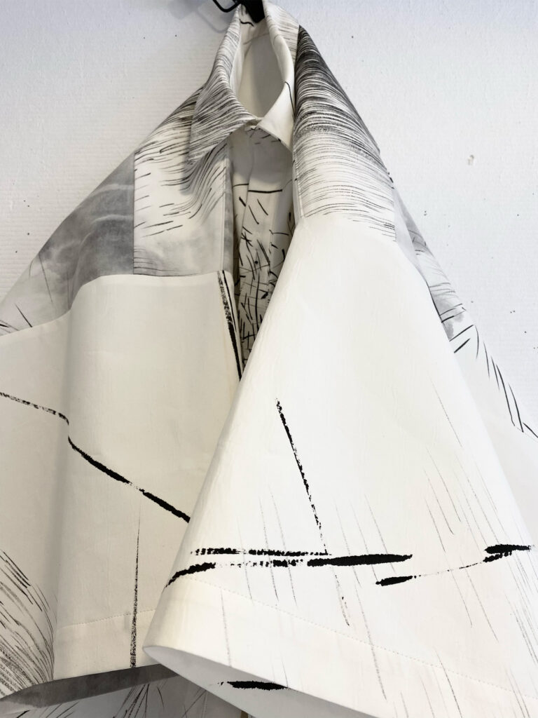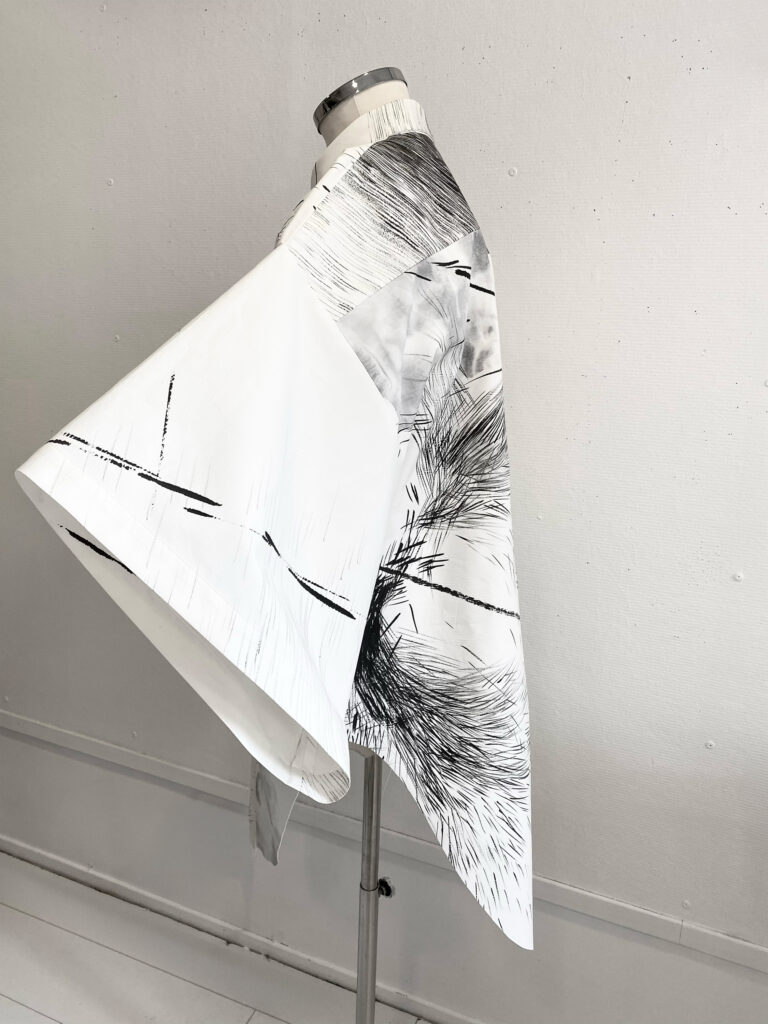 Wearable art piece, hand-painted in sumi ink on bonded, paper-like cotton, one-off KIMO shirt