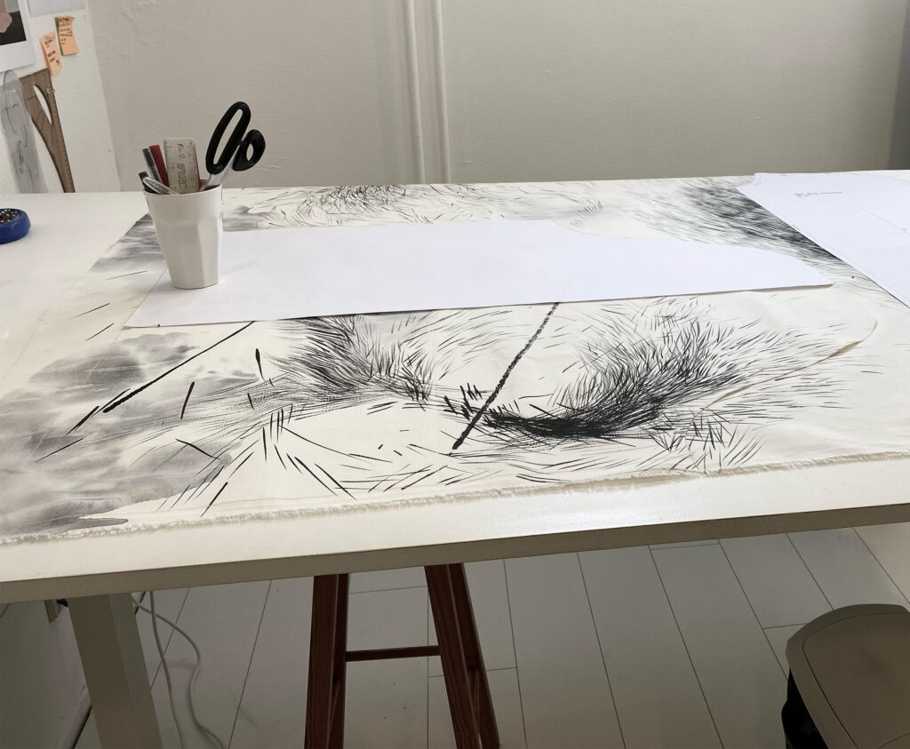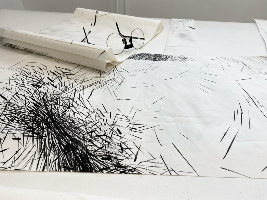 Daijiro Hama (1984) grew up in Shimane, Japan, and makes use of traditional Japanese materials and techniques. His practice is shaped by cultural experiences from both his magical homeland and living abroad, exploring insights into human existence. Through contrast in black and white, Daijiro seeks to express the invisible. His monochromatic compositions invite viewers to look beyond what is seen and into what remains unseen – reflecting the depths of the soul and mind.